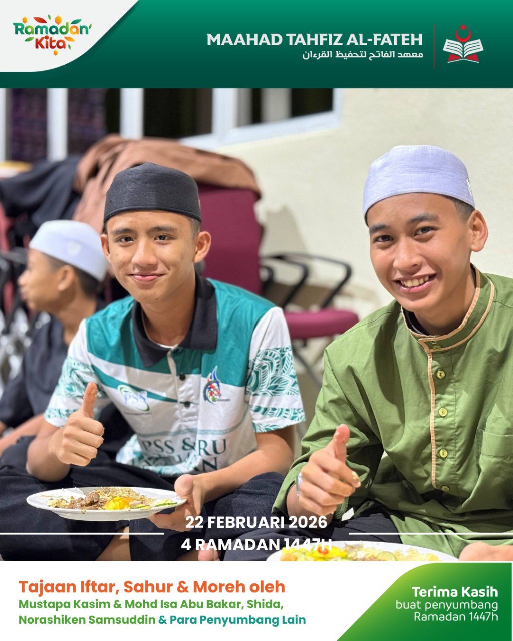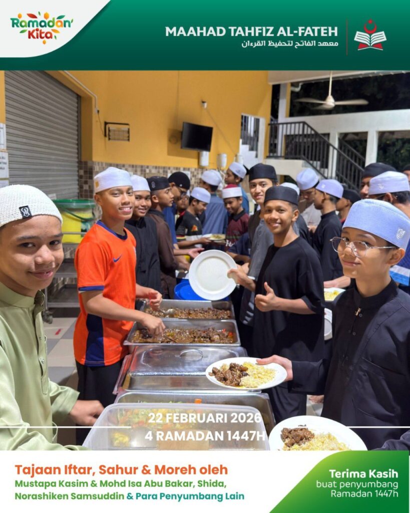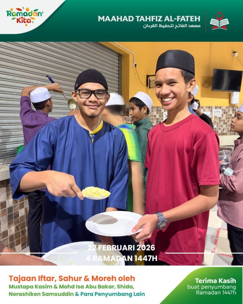 Para pelajar Maahad Tahfiz Al Fateh telah menikmati juadah berbuka puasa dalam suasana penuh kesyukuran. Sumbangan ini bukan sekadar hidangan, tetapi menjadi sumber kekuatan buat mereka dalam meneruskan hafazan Al-Quran.