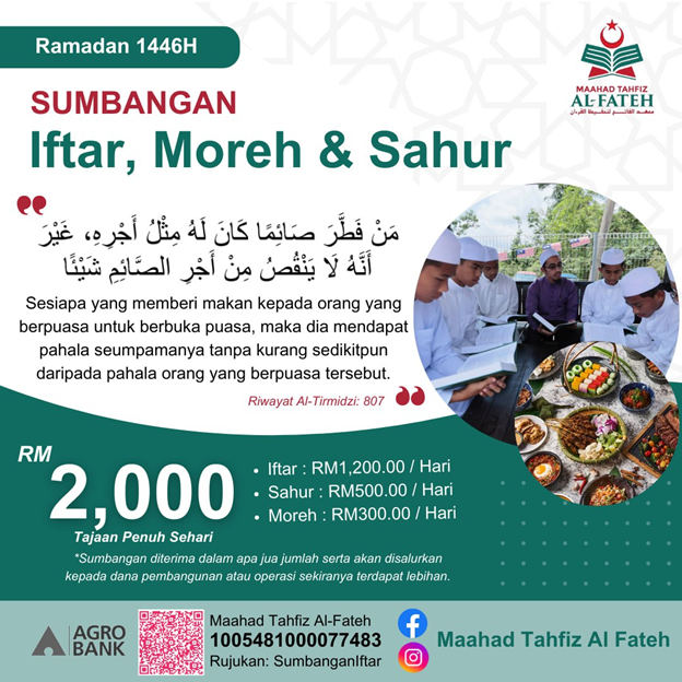 Maahad Tahfiz Al-Fateh ingin mengajak para dermawan untuk menyumbang tajaan Iftar, Moreh, dan Sahur bagi pelajar-pelajar tahfiz kami sepanjang bulan Ramadan. Program ini bertujuan untuk memberi penghargaan kepada para pelajar yang sedang berusaha menghafal Al-Quran, serta untuk membantu mereka menjalani ibadah puasa dengan lebih baik.Dari Abu Hurairah berkata, Rasulullah SAW bersabda: “Ada tiga golongan yang tidak ditolak doanya: pemimpin yang adil, orang yang berpuasa hingga ia berbuka, dan doa orang yang terzalimi yang diangkat oleh Allah di atas awan, dibukakan baginya pintu-pintu langit, lalu Allah berfirman: ‘Demi kemuliaan-Ku, Aku pasti akan menolongmu meski setelah beberapa waktu’.” (HR Al-Baihaqi dalam As-Sunan Al-Kubra, Sunan Ibnu Majah, dan Sunan At-Tirmidzi)